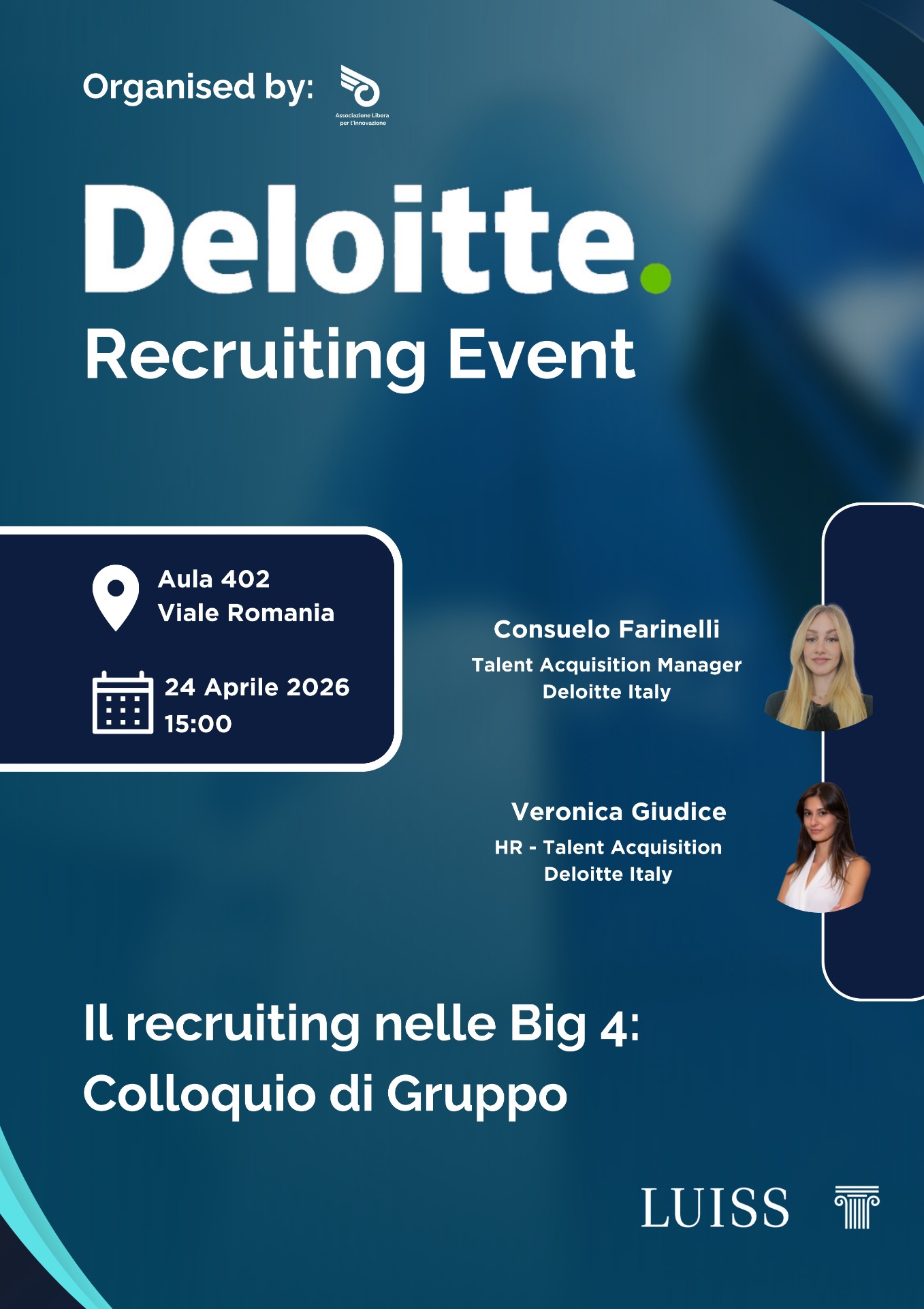 Durante l’incontro saranno presenti due recruiter Deloitte che accompagneranno i partecipanti in un percorso strutturato, simile a una vera selezione aziendale. L’obiettivo è osservare competenze trasversali fondamentali per il mondo del lavoro.